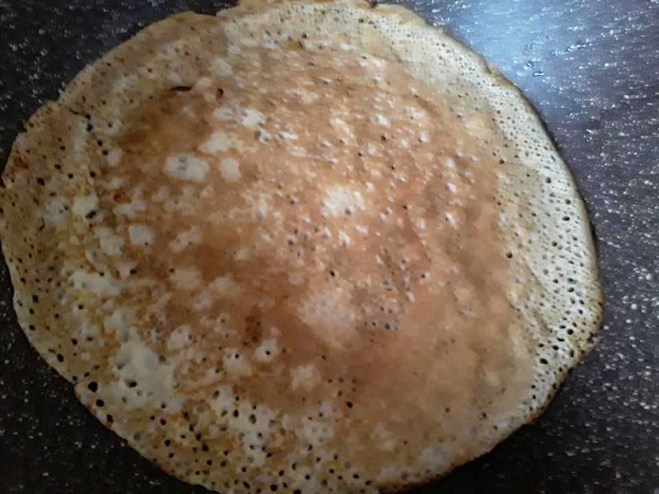 - Когда края блинка начнут золотиться, переверните его и жарьте с другой стороны10-15 секунд до готовности.