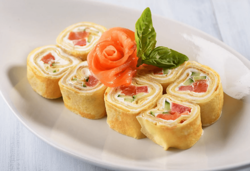 Роллы из яичных блинов с семгой и икрой