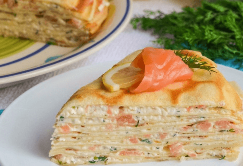 Блинный пирог с красной рыбой