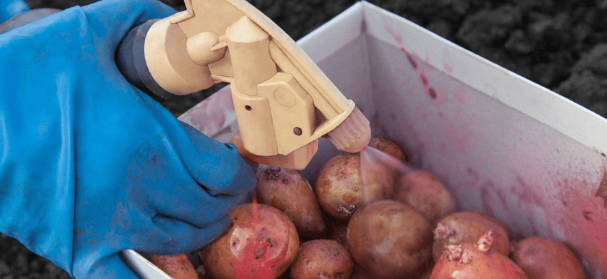 Картофель на недостаток бора отвечает паршой, ломкостью листьев и красноватостью черешков. Если картофель растет на сильно истощенных почвах, то можно концентрацию раствора увеличить. В этом случае растворяют 5 грамм борной кислоты в 10л воды и этим раствором опрыскивают картофель.