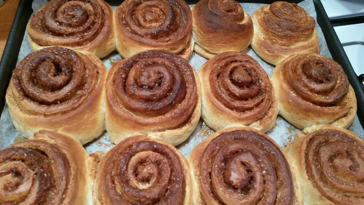 Ингредиенты: молоко — 500 мл, яйца — 3 шт., масло сливочное — 200 г, дрожжи сухие активные — 1 пачка (11 г), сахар — 100-150 г, мука — 1-1,2 кг, сахар и корица для посыпки – по вкусу.