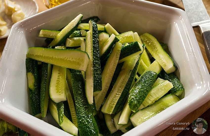 2. Чем мельче будут огурчики, тем быстрее они просолятся и станут пригодными для дегустации. Замоченные плоды на 2-3 часа вынуть и обсушить. А вот порезать их можно так, как понравится хозяйке – ломтиками, дольками или слайсами.