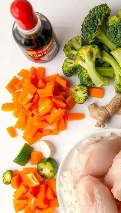 - Подготовка ингредиентов: Куриное филе нарезать небольшими кусочками. Лук нарезать полукольцами, морковь – соломкой, болгарский перец – полосками, брокколи разделить на соцветия. Чеснок и имбирь мелко порубить.