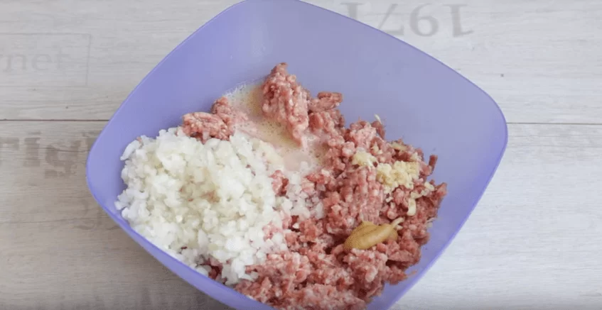 2. В измельченное мясо добавить луковицу – мелкой крошкой, рисовую крупу, яйцо, немного подсолить, поперчить и все хорошенько размешать.
