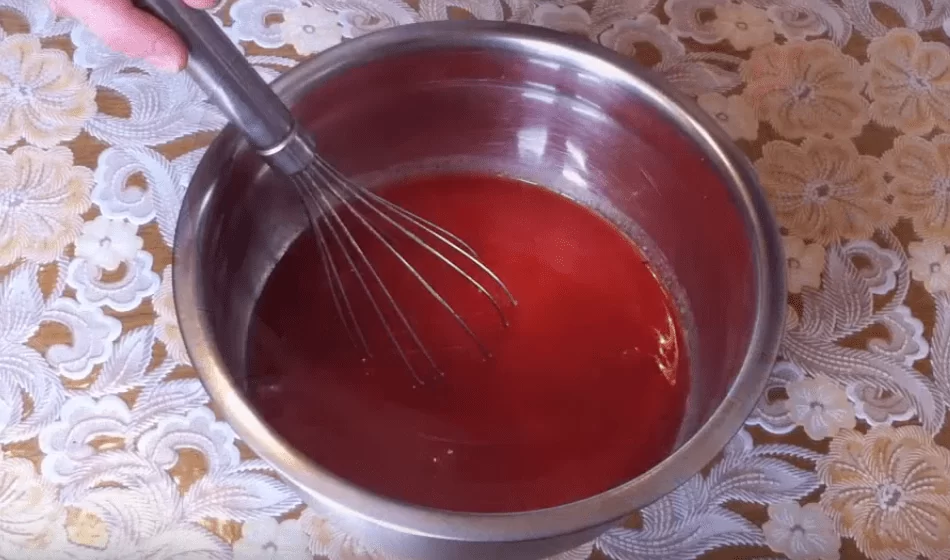 5. Пока овощи обжариваются, в отдельную миску выкладываем томатную пасту, добавляем к ней соль, перец, муку, наливаем воду и взбиваем все венчиком до однородной смеси.