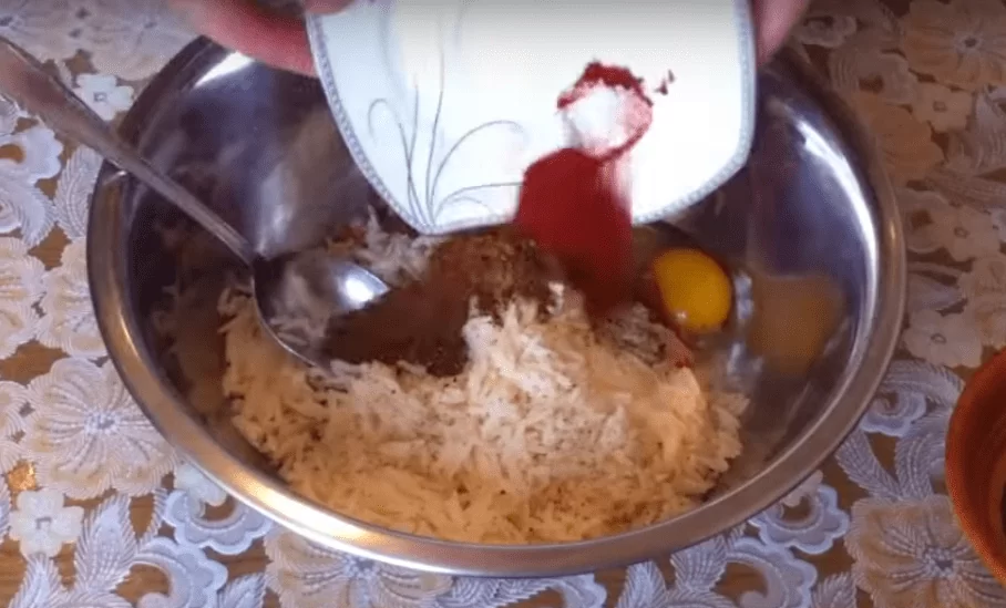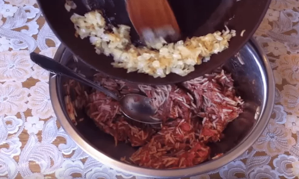 1. В одной миске соединяем фарш, полу отваренный рис, одно яйцо, специи, соль и перец. Хорошо все перемешиваем.