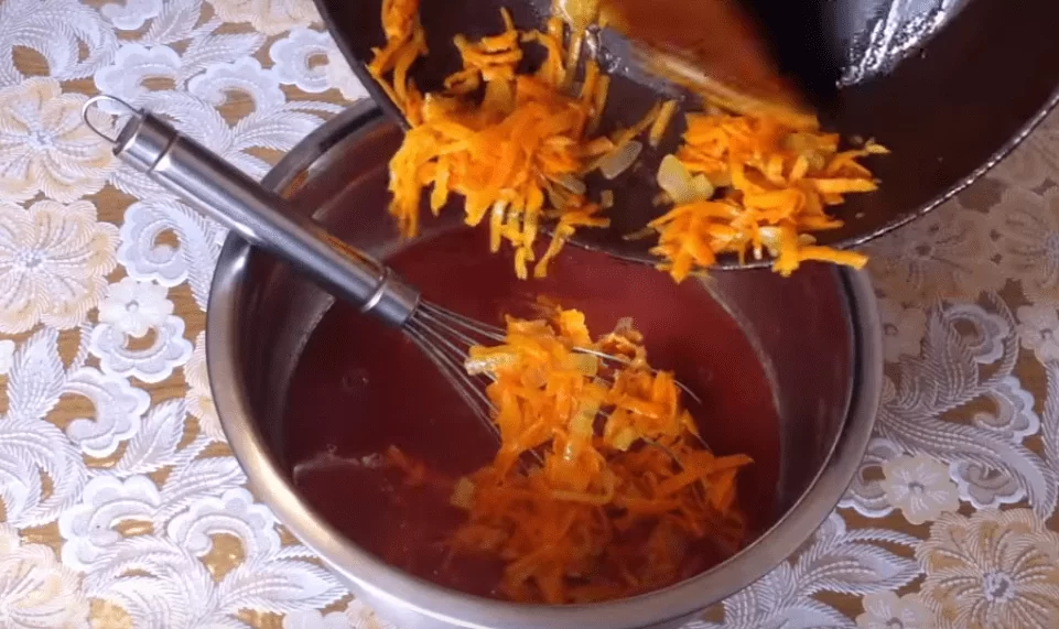 6. Затем добавляем к соусу приготовившиеся морковь с луком и еще раз перемешиваем.