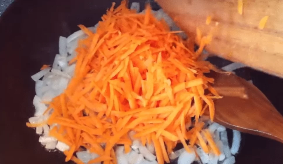 Луковицу мелко нарезаем, морковь чистим и натираем на крупной терке. Жарим на растительном масле. Я жарю одновременно и лук и морковь на одной сковороде.