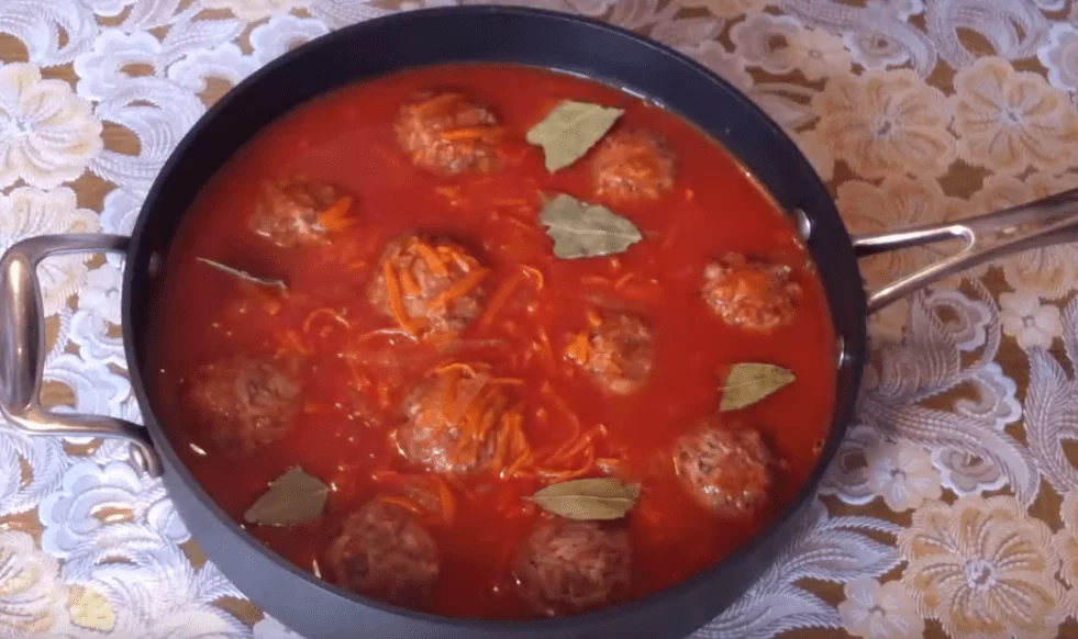 7. Заливаем приготовленным соусом тефтели и кладем сверху лавровый лист.