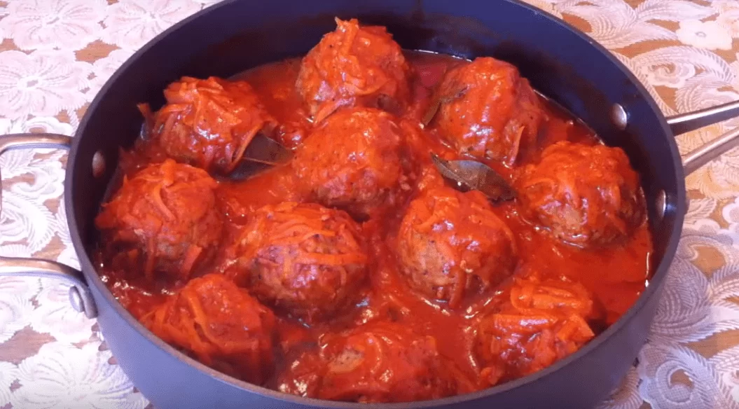 8. Сковороду накрываем крышкой и ставим ее на медленный огонь. Когда соус закипит, засекаем еще 30 минут. После этого тефтели с томатной подливкой будут готовы.