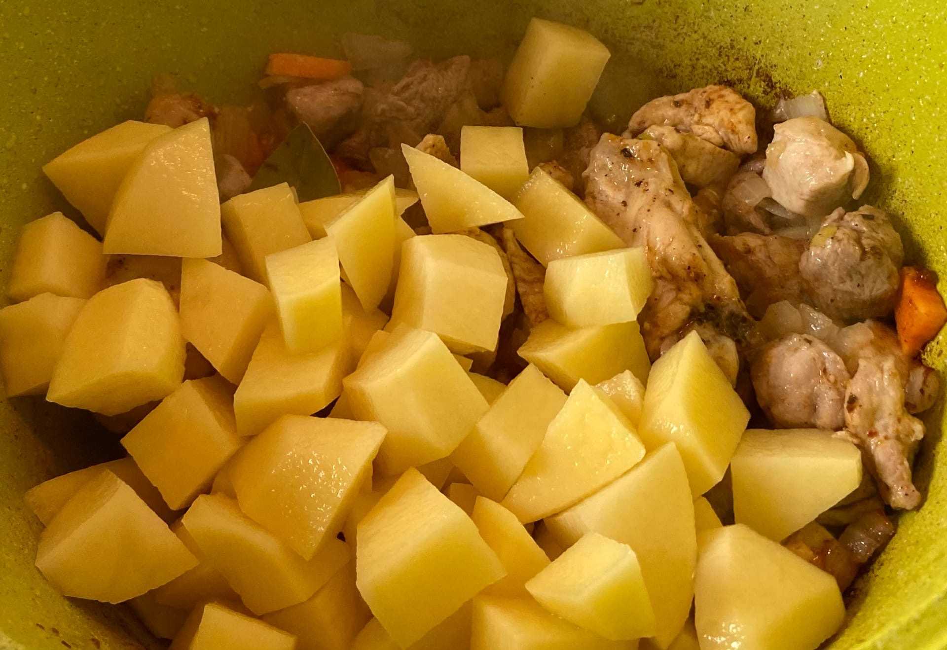 - Картофель чистим, моем и нарезаем кубиком немного крупнее чем мясо.