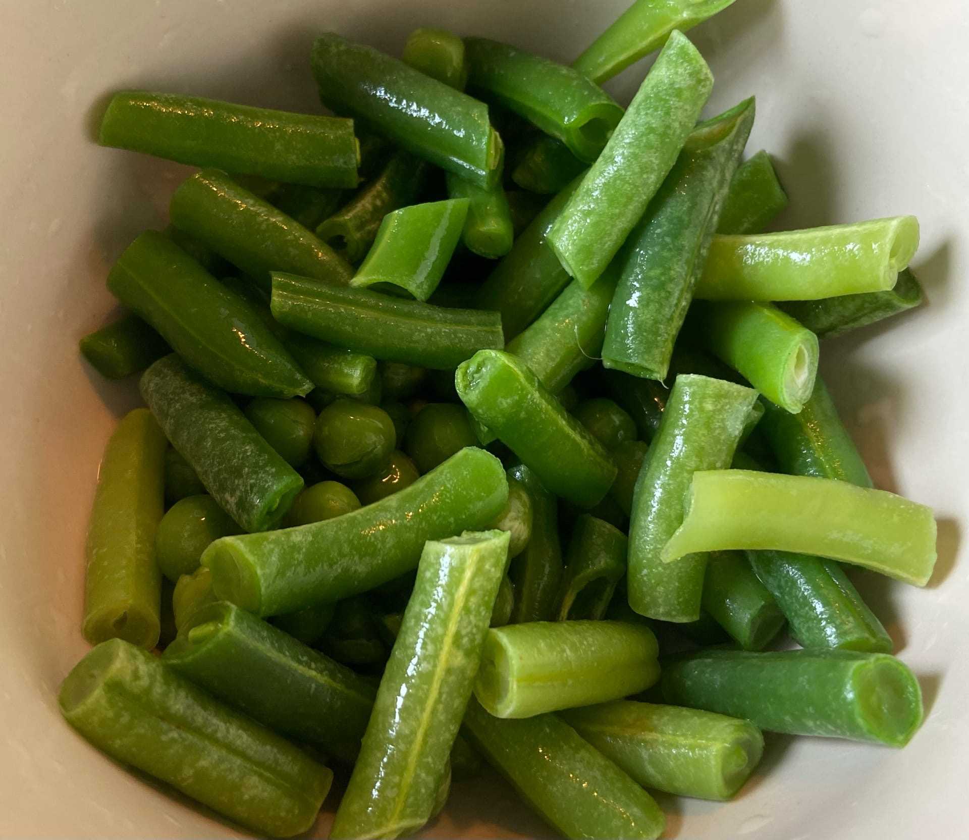 - В конце отправляем стручковую замороженную фасоль и замороженный зеленый горошек. Также не забываем про зелень — ее тоже добавляем в блюдо. Даем покипеть еще около 2 минут и выключаем плиту.