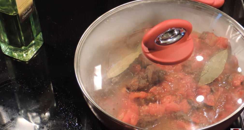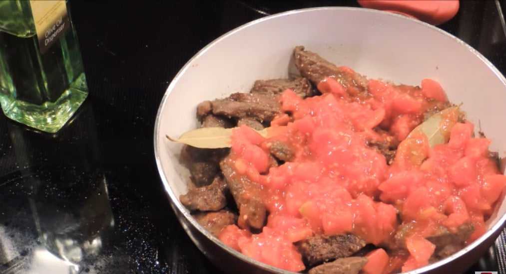 По желанию вместо томатной пасты можно отдельно сварить томатный соус и залить им мясо с луком, или же просто разложить поверх лука кружочки помидоров и влить небольшое количество воды.