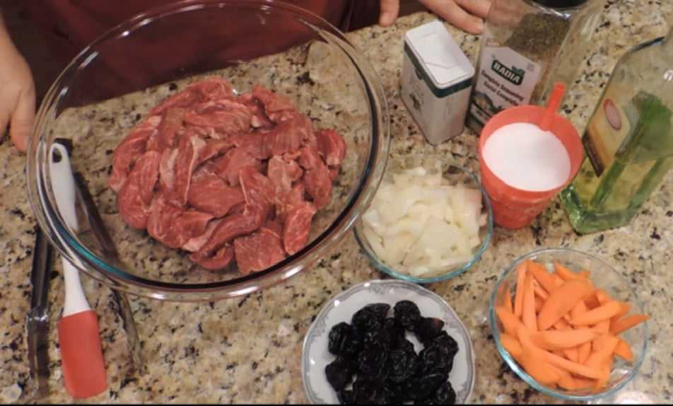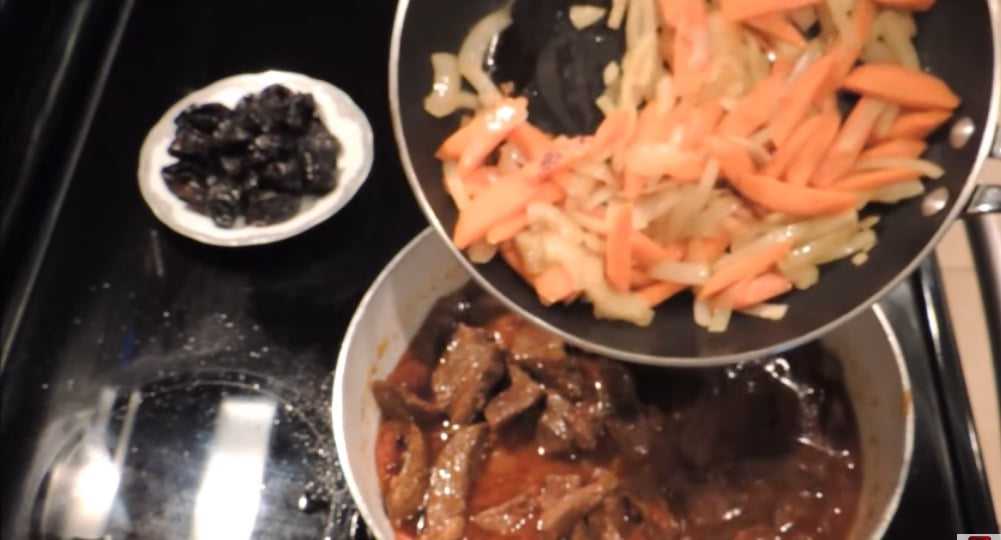 Говядину лучше заранее замариновать, приготовив слабый раствор уксуса или сока лимона. В маринад для говядины лучше добавлять белое сухое вино, которое идеально для блюд с черносливом и луком. Тушеная говядина, приготовленная в красном соусе с добавлением томатной пасты с черносливом, имеет приятный нежный вкус.