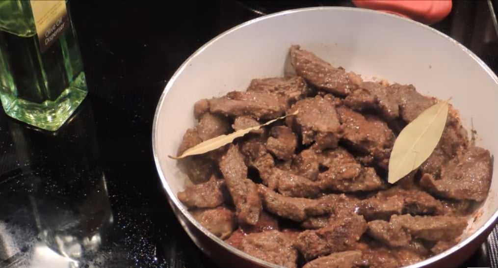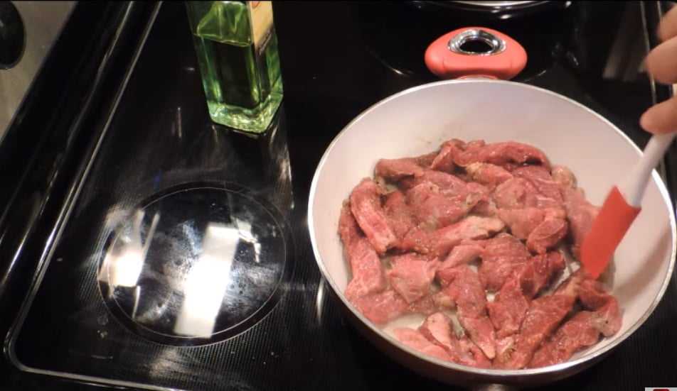 Мясо обжаривают в сковороде на масле при сильном огне по 1 минутки со всех сторон.