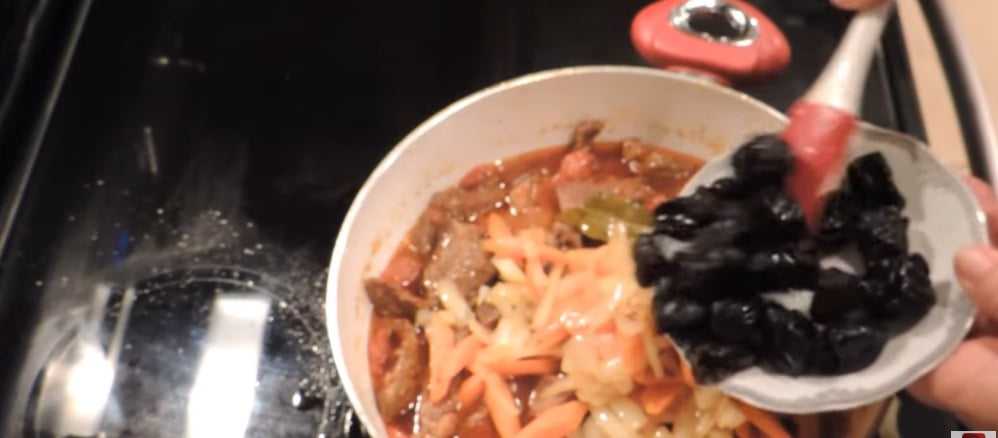 Высыпьте чернослив к мясу с овощами и дайте по томиться еще 20 мин при закрытой крышке на слабом огне.