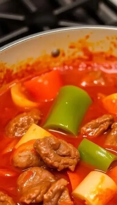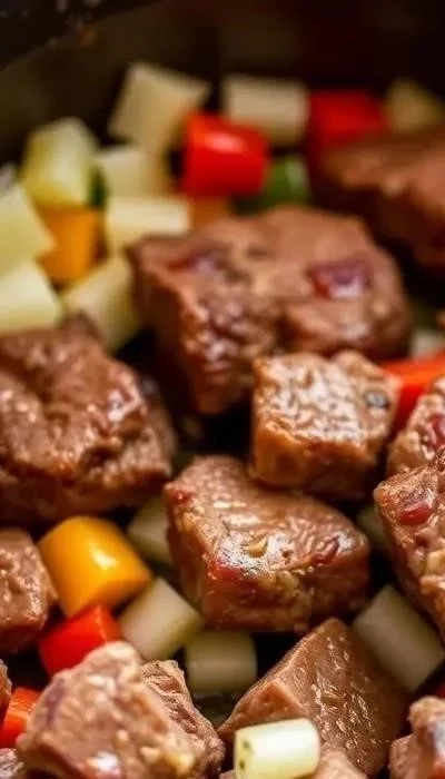 - Тушение: Уменьшить огонь до минимума, накрыть сковороду крышкой и тушить говядину с овощами в течение 1,5-2 часов, периодически помешивая и при необходимости добавляя немного воды или бульона.
