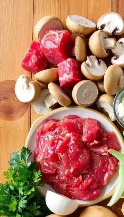 Совет по выбору продуктов: Для говядины выбирайте мясо с небольшим количеством жира, чтобы оно получилось нежным и сочным. Грибы можно использовать любые, но шампиньоны – самый доступный и универсальный вариант. Картофель для пюре лучше брать рассыпчатых сортов, например, «Беллароза» или «Скарб».