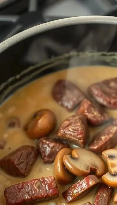 - Тушение: Уменьшить огонь до минимума, накрыть сковороду крышкой и тушить говядину с грибами в сметанном соусе в течение 1,5-2 часов, периодически помешивая. Чем дольше тушится мясо, тем нежнее оно становится.