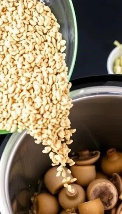 - Добавление гречки: Добавьте в чашу мультиварки гречневую крупу. Перемешайте с луком и грибами.