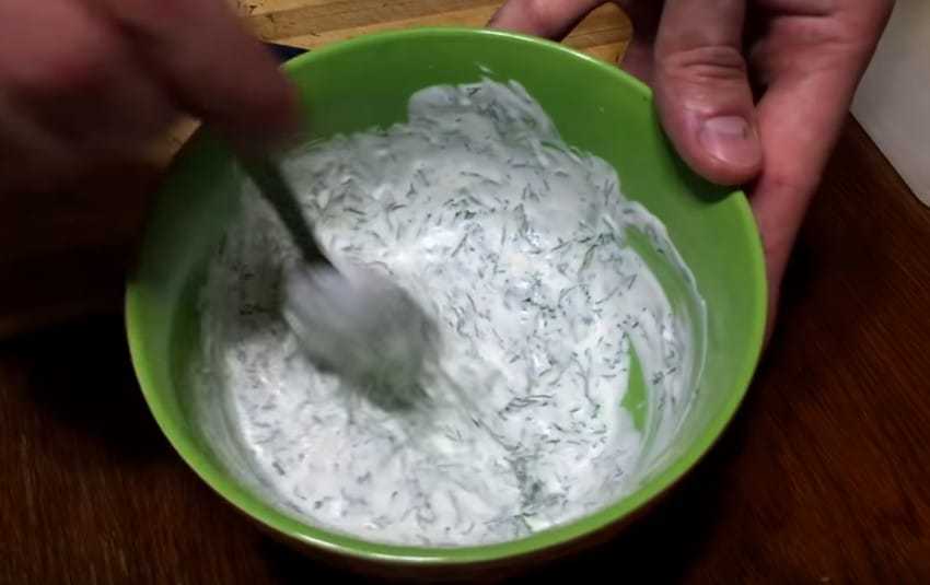 10. Для соуса в отдельной емкости соедините сметану и майонез (1 часть сметаны + 1 часть майонеза). Выдавите отложенные 2 зубчика чеснока. Посолите , добавьте нашинкованный укроп. Тщательно перемешайте соус.