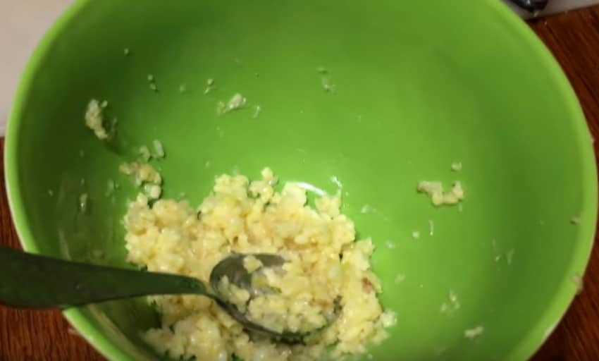 Чеснок для приготовления масла нужно пропустить через чеснокодавку или натереть на мелкой терке, потому что в дальнейшем он пригодится для приготовления чесночного соуса к гренкам, кроме того в измельченном виде чеснок лучше передаст маслу свои полезные свойства.