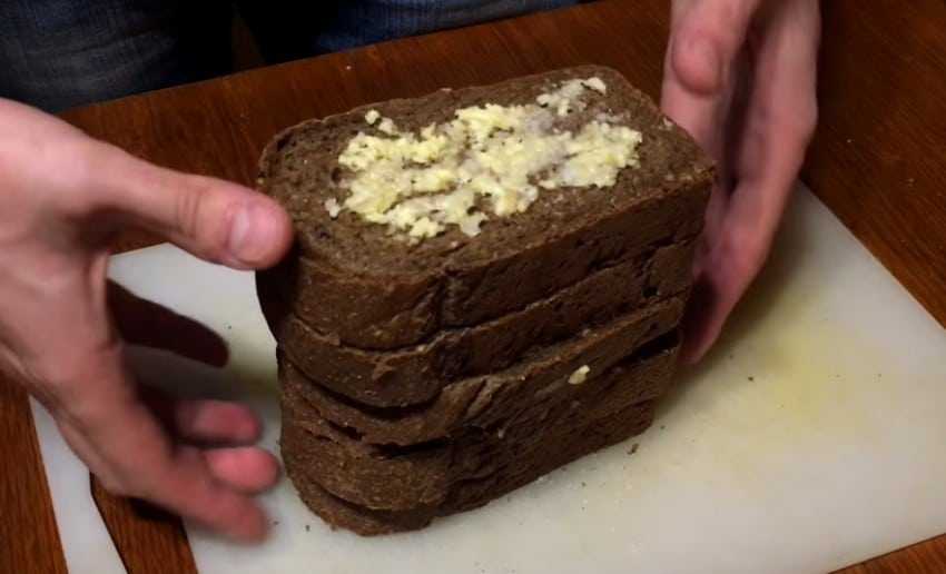 4. Сложите хлебные куски слоями друг на друга (слой хлеба — чесночная смесь — соль, повторите). Отложите пирамиду и дайте ей промариноваться в течение 5 минут.