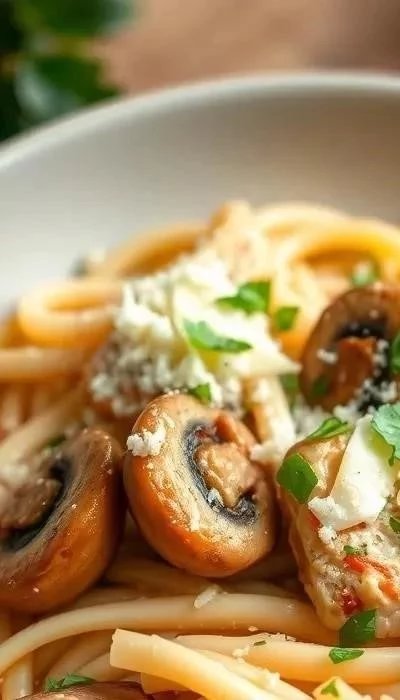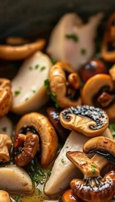 - Обжарка курицы и грибов: В сковороде разогреть оливковое масло. Обжарить курицу до золотистой корочки. Добавить лук и чеснок, обжарить до мягкости. Затем добавить грибы и жарить до готовности, пока не испарится вся жидкость.