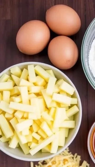 - Приготовление теста: Отожмите лишнюю жидкость из картофельной массы. Добавьте яйца, муку, соль и перец. Тщательно перемешайте до однородной консистенции.