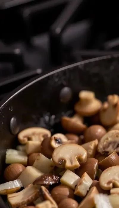 - Обжаривание лука и грибов: Разогрейте растительное масло в сковороде и обжарьте лук до золотистого цвета. Добавьте грибы и обжаривайте их до готовности, пока не испарится вся жидкость.