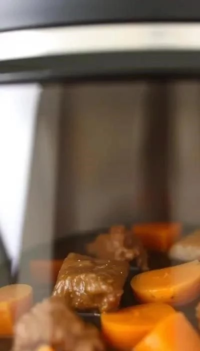 - Шаг 1: Обжаривание. В режиме «Жарка» обжарить говядину до золотистой корочки.
