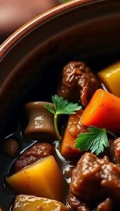 - Подача: Готовую говядину с картофелем и грибами посыпать свежей зеленью и подавать горячей.