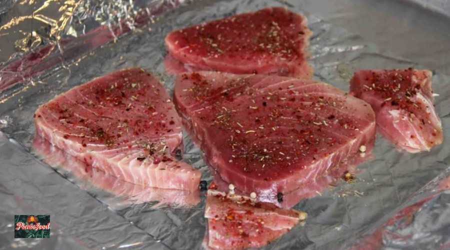 - Далее можно застелить противень пищевой фольгой, смазать её подсолнечным маслом и выложить предварительно размороженные при комнатной температуре стейки тунца. Противень можно поставить на решетку и запекать стейки с одной стороны 2 мин.