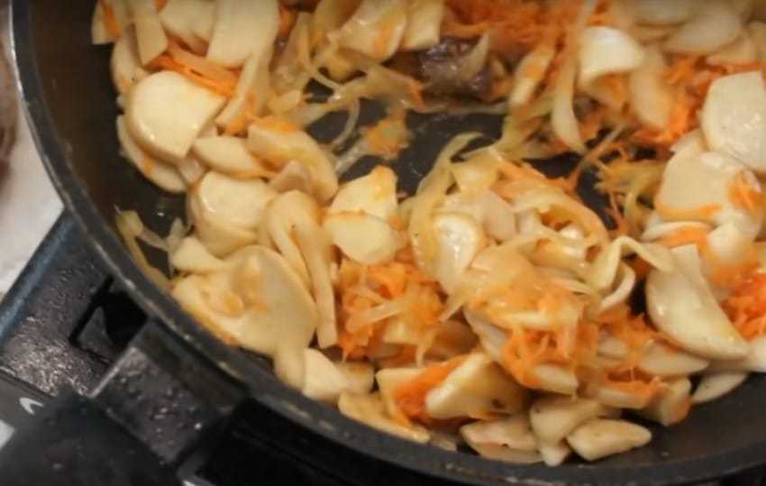 - Овощи спассеровать на той же сковороде и выложить сверху на мясо;