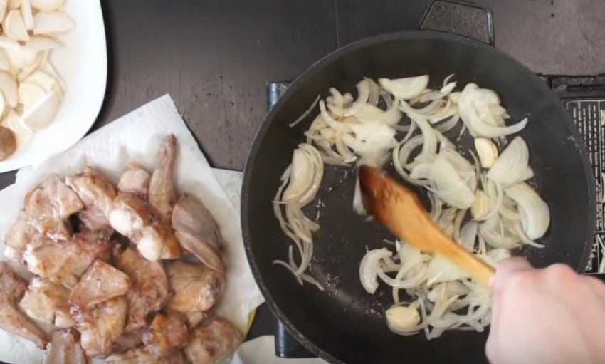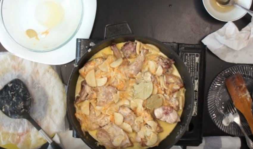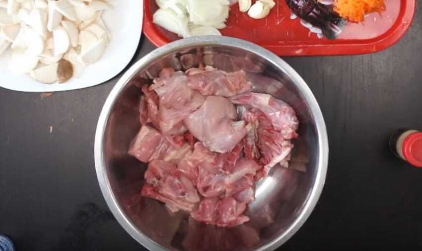 Вкусный кролик, тушенный на сковороде с грибами в сметанном соусе