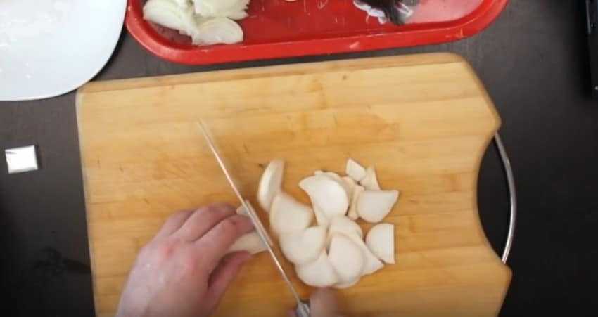 - Почистить лук с морковью. Лук покрошить полукольцами, а морковь тонкими брусками;