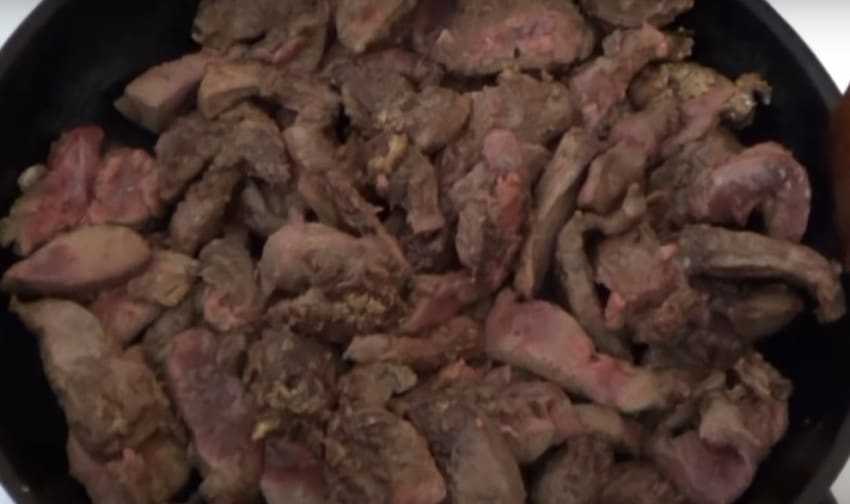 Добавить к сердцу кусочки печенки. Также быстро поджарить, постоянно помешивая.