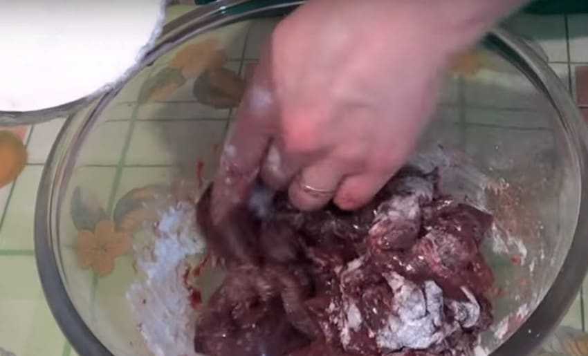 - Нарежьте свиную печень и легкое кусочками и обжарьте на сковороде с мукой до золотистой корочки.