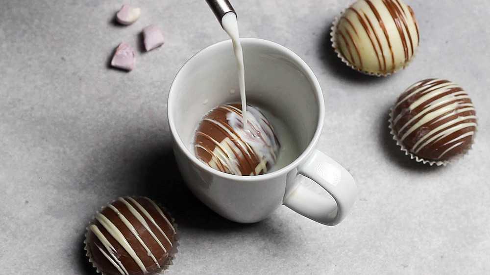 - Одну половинку сферы заполняю маршмеллоу, ломтиками черного шоколада (какао, растворимым кофе – по желанию). Мелкие зефиринки продаются в виде кубиков, звездочек, цветочков. Чем мельче получится приобрести маршмеллоу, тем интереснее получится картинка «взрыва». В горячее молоко кидают шарик, заполненный порошком какао или шоколадными каплями. А в чашку с кофейным напитком лучше отправить сферу, заполненную растворимым кофе с зефиринками. Цветная посыпка внутри тоже украсит напиток.