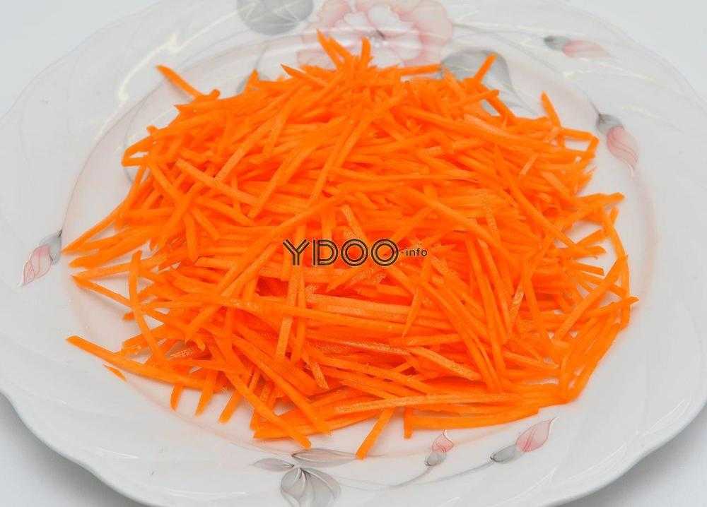 Если у вас нет готовой морковки корейской, приготовим ее сами. Очистим морковь и натрем на специальной терке.