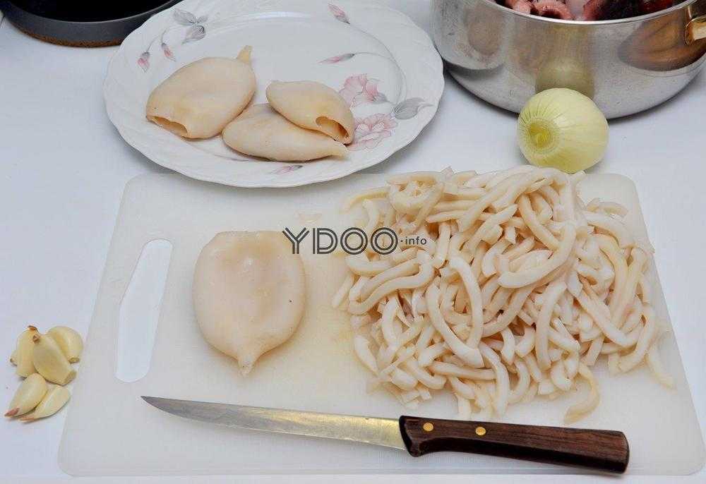 - Моллюсков освободить от внутренностей и сделать насечки. Далее нарезать их лентами по 3 см.