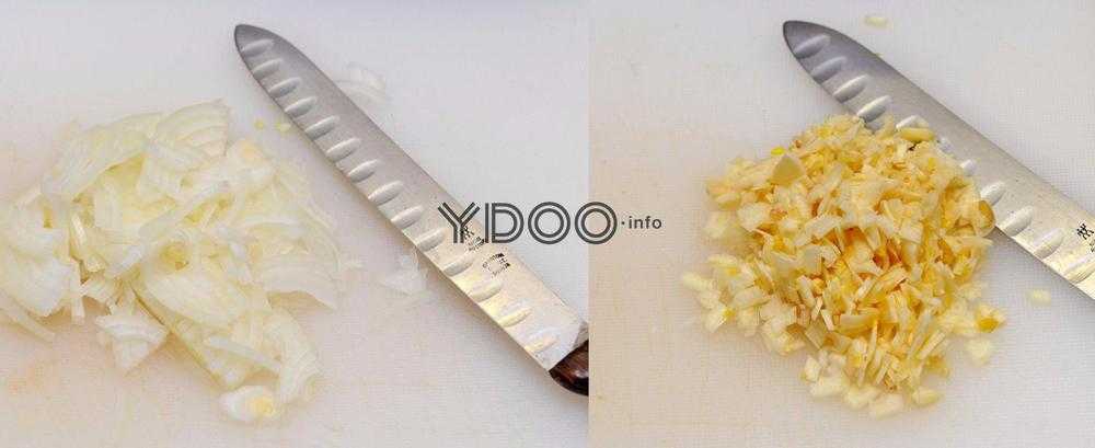 Очищаем чеснок, кладем на доску и надавливаем ножом, затем мелко рубим.