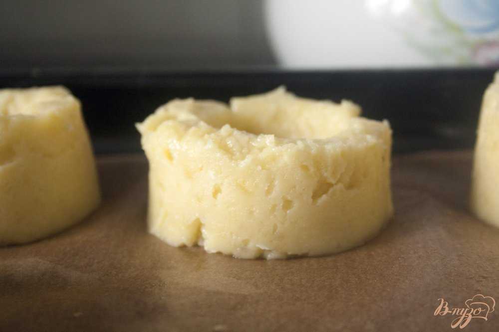 Противень застилаем пергаментной бумагой (если нет уверенности в ее качестве, можно дополнительно смазать тонким слоем масла). Выкладываем порции картофеля, из каждой вручную формируем гнезда диаметром около 7 см. Делаем сплошное дно и невысокие бортики. С помощью чайной ложки подравниваем форму.