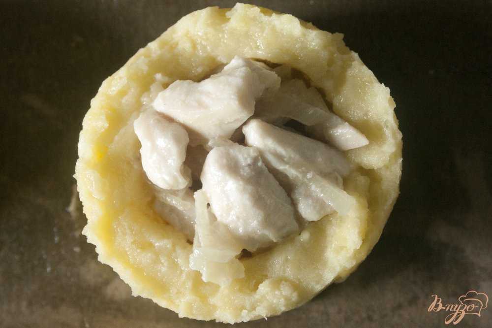 8. Из картофельного пюре формируют шарики, пальцами делают в них небольшую дырочку, в которую кладут по 1 чайной ложечки куриного фарша с луком, аккуратно выкладывают гнезда на заранее промазанный маслом жарочный лист.