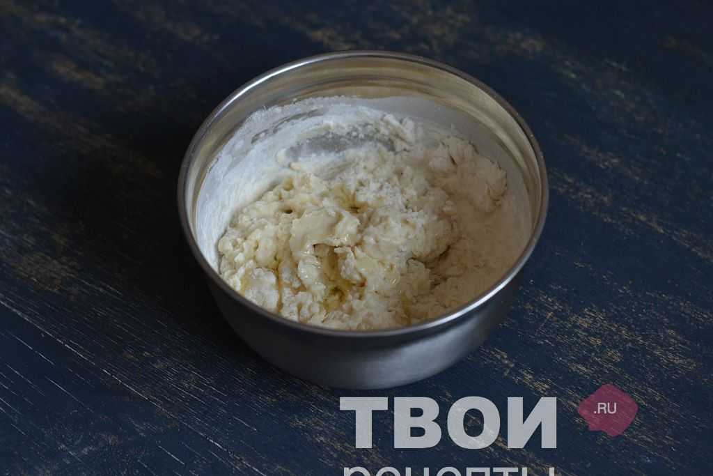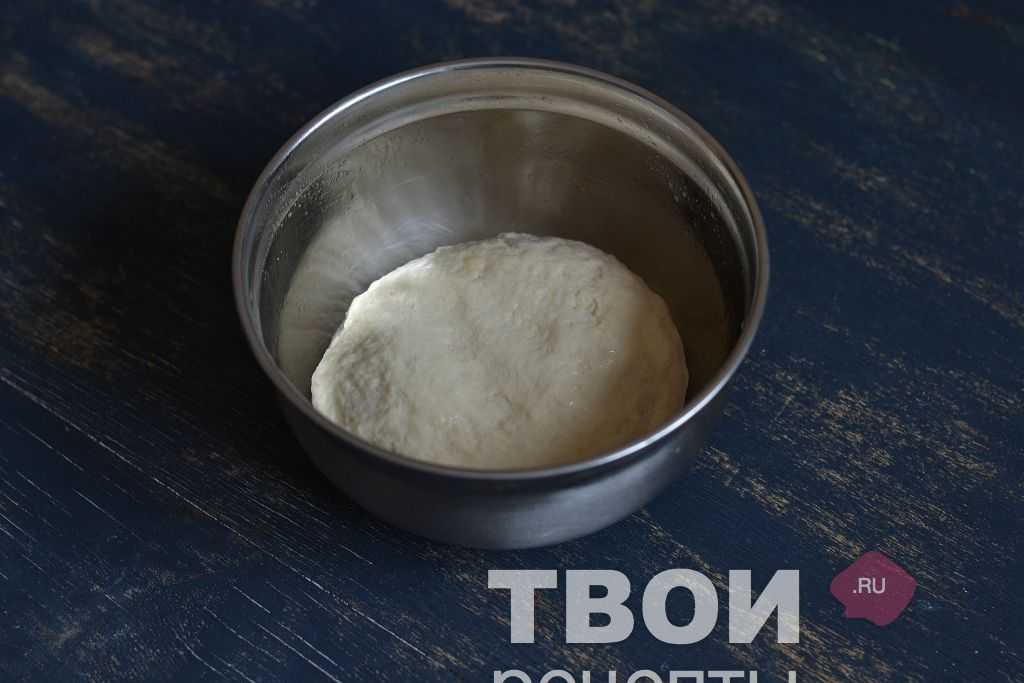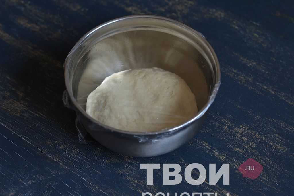 Подсыпаем муку небольшими порциями и замешиваем тесто. Готовое тесто накрываем пищевой пленкой и оставляем на 30 минут, затем, разделяем на 6-8 равных частей.