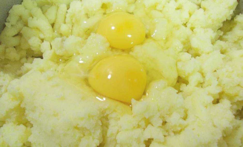 1.Картофель очищаем от шкурки, моем и ставим вариться до полной готовности. Посолить. Воду слить полностью и потолочь толкушкой или в блендере. Добавить сливочное масло, дать чуть остыть, вбить яйцо. Количество яиц регулируем сами. Солим и тщательно перемешиваем.