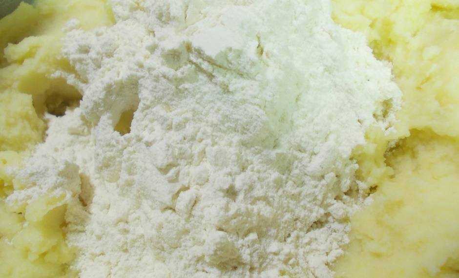 2. Для получения картофельного теста, кладем муку и замешиваем тесто, оно должно быть похоже на заварной крем, но не прилипать к рукам. Стараемся мукой не злоупотреблять, чтобы не забить тесто. Количество муки по рецепту в самый раз.