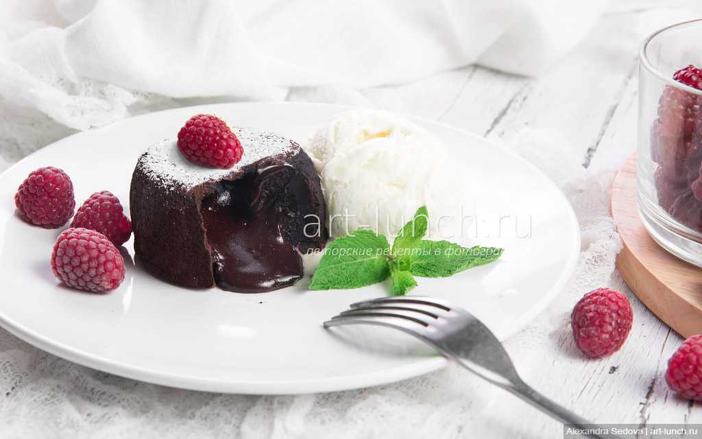 Подают теплый шоколадный фондан с мороженым, шоколадной глазурью или фруктами.