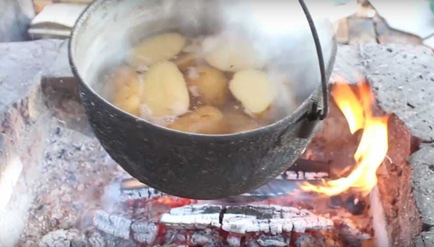 2. Переложите овощи в котелок, залейте её чистой водой и повесьте котелок над огнём. Когда вода закипит, добавьте соли.