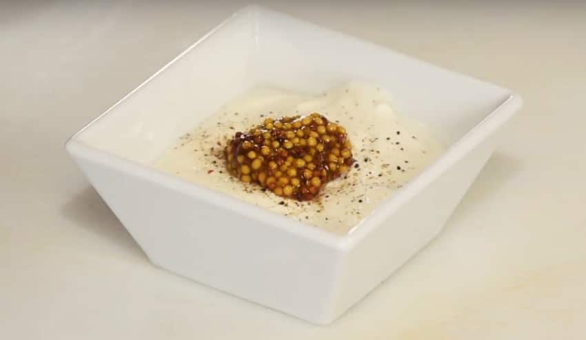 2. Для соуса в небольшую пиалу выложите сметану, черный перец, соль, зернистую горчицу. Раздавите и порубите ножом чеснок, все перемешайте.